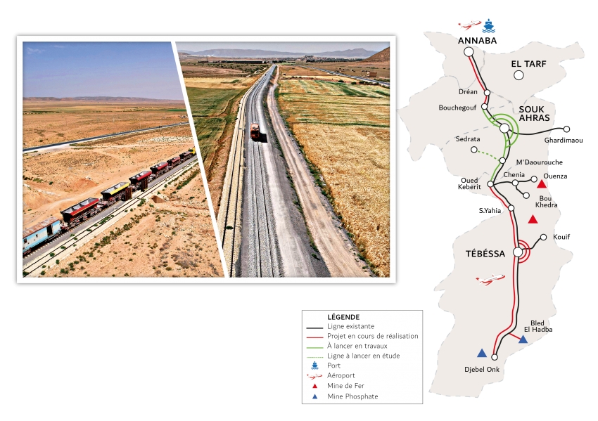 Pour rappel, la ligne minière Est constitue un maillon stratégique reliant les gisements miniers du Sud-Est du pays au port d’Annaba. S’étendant sur 422 kilomètres, elle relie Annaba aux mines de Djebel El-Onk, au sud de la wilaya de Tébessa, et traverse cinq wilayas regroupant plus d’un million d’habitants. 297 km en cours de dédoublement et de modernisation . Comprend 30 gares et haltes réparties le long du tracé.