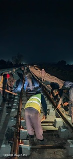 Les interventions en cours concernent notamment les opérations de pose et de bourrage de la voie ferrée, ainsi que les travaux de soudage des rails, en particulier au niveau de la gare d’El Hadjar.